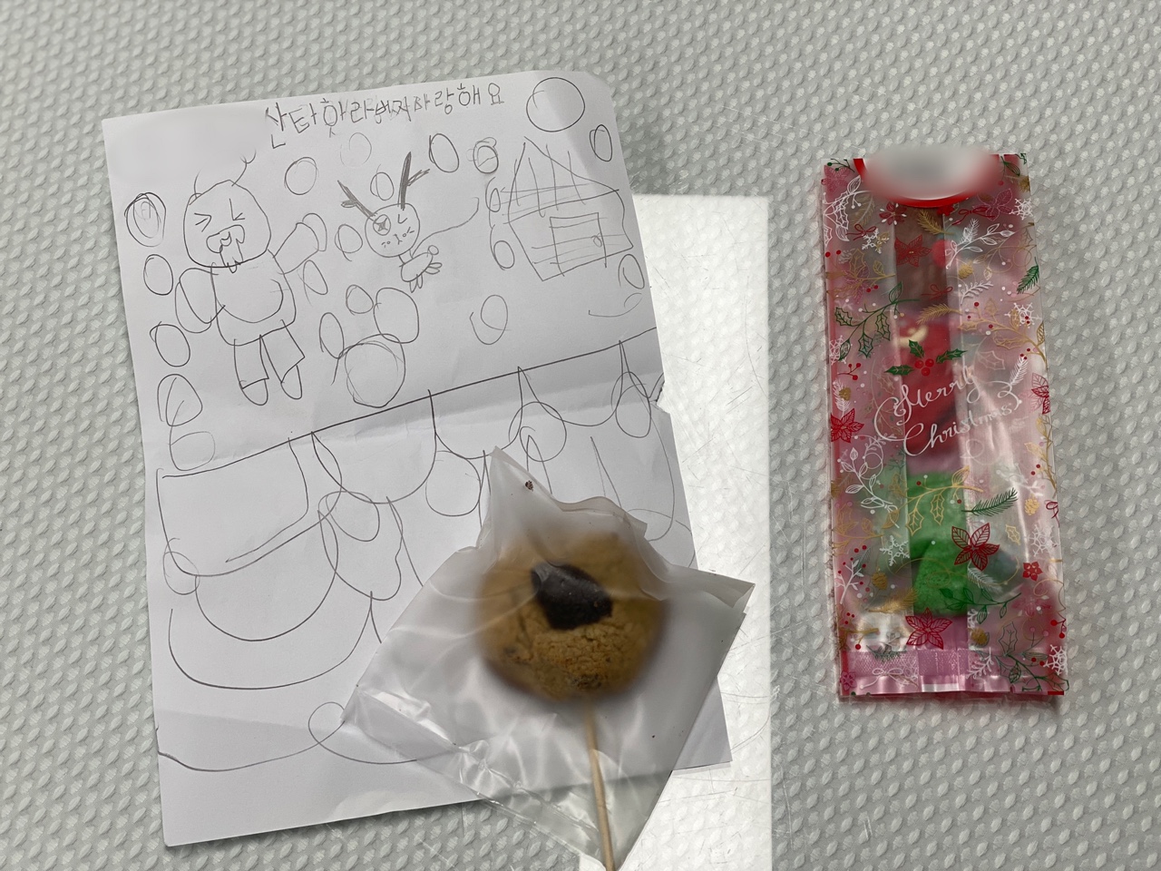 복지관에서 준비한 과자꾸러미와 곰돌이 귀마개를 전달하였는데요.